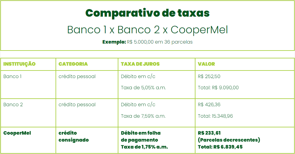 | CooperMel | crédito | Débito em folha Taxa de 2,25% a.m. | R$ 259,37 Total: R$ 7.529,13 |